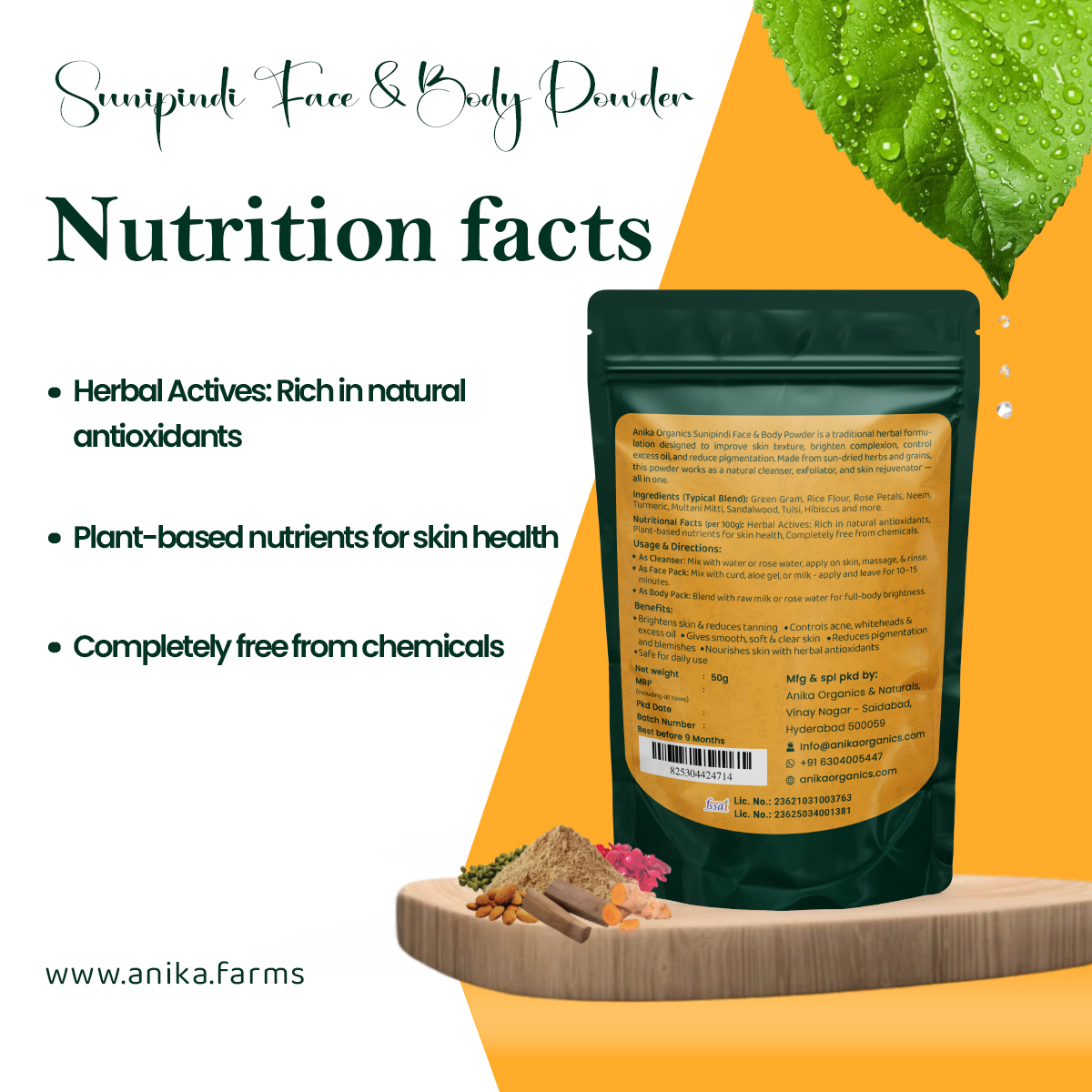 Anika Organics Sunipindi Face & Body Powder is a traditional herbal formulation designed to improve skin texture, brighten complexion, control excess oil, and reduce pigmentation. Made from sun-dried herbs and grains, this powder works as a natural cleanser, exfoliator, and skin rejuvenator — all in one.