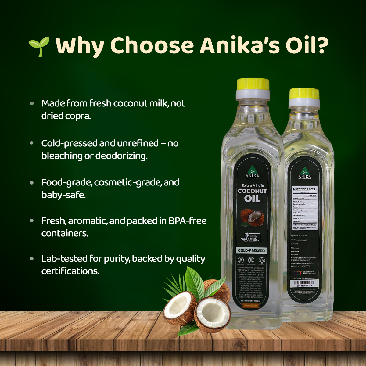 Virgin cold-pressed coconut oil is extracted from fresh, raw coconut milk using a wooden cold-press method without heat or refining. Unlike regular cold-pressed coconut oil made from dried copra, this oil retains the full flavor, nutrients, and delicate aroma of fresh coconuts. It is considered the purest and most natural form of coconut oil.